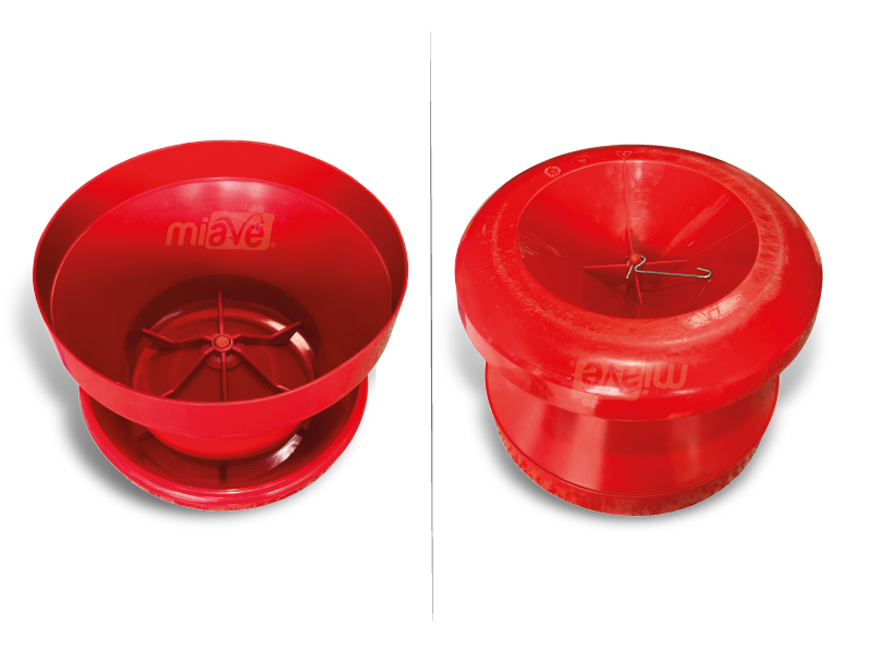 Comedero automático por gravedad de fabricación brasileña, diseñado para la etapa de iniciación avícola. El diseño del plato facilita el acceso al alimento para los pollitos, mientras que la tolva asegura un suministro constante sin atascos.