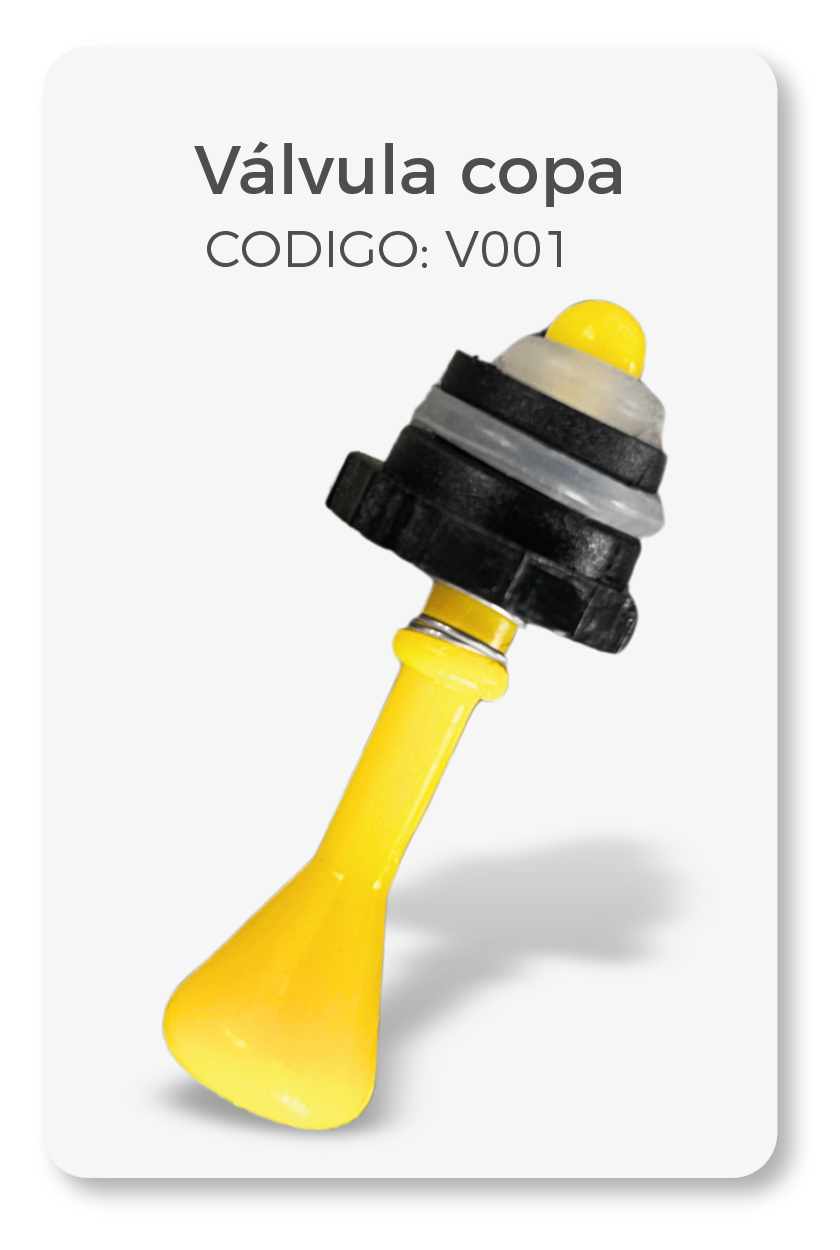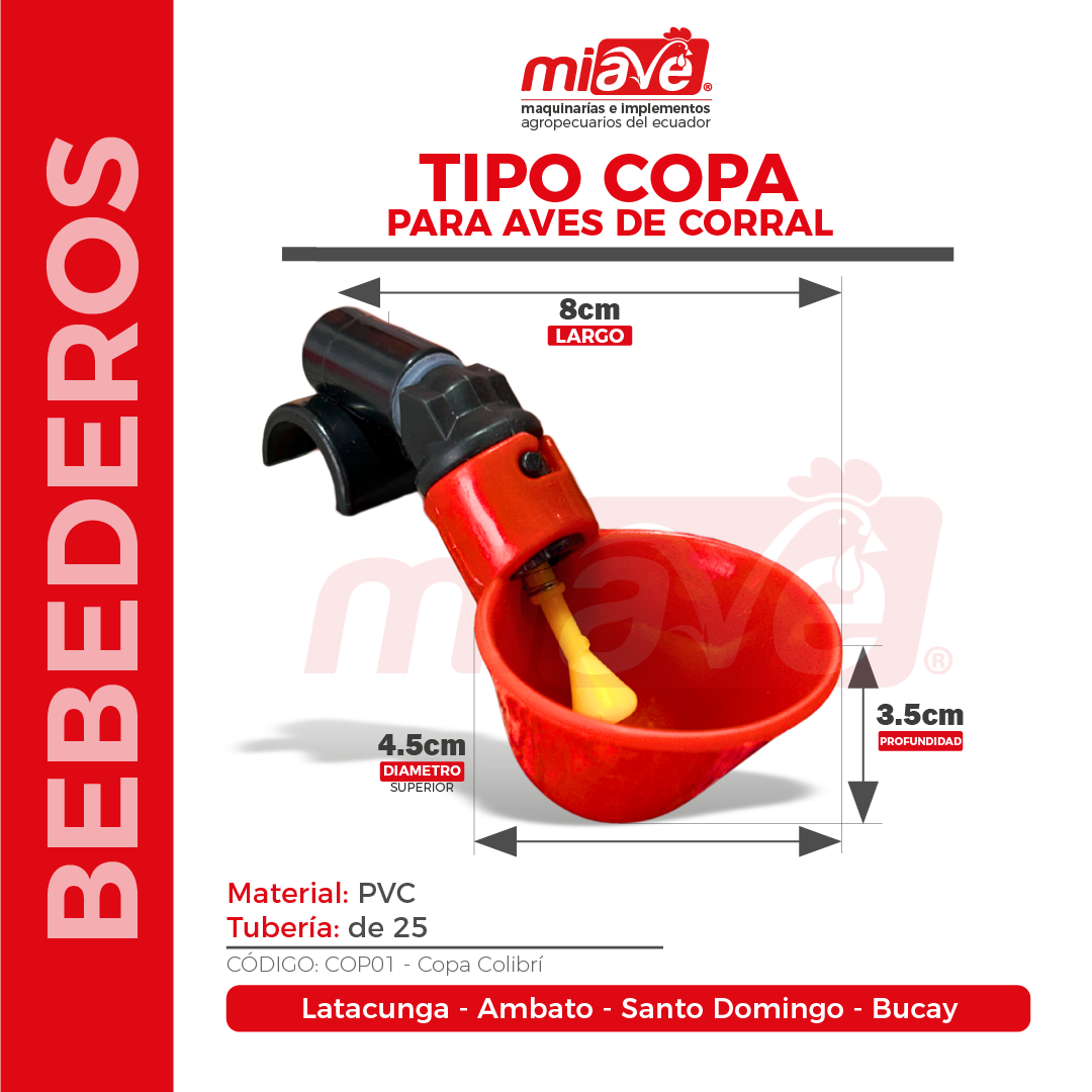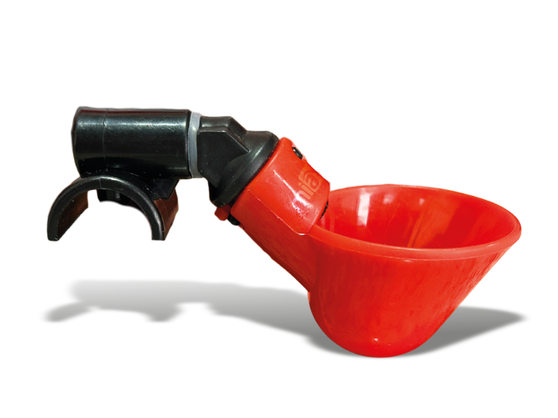 Bebedero automático tipo copa diseñado para instalarse en cubetas o líneas de agua, ofreciendo un suministro constante y limpio para aves de corral. Su diseño atrae fácilmente a las aves y permite ajustar el flujo según la necesidad del lote.