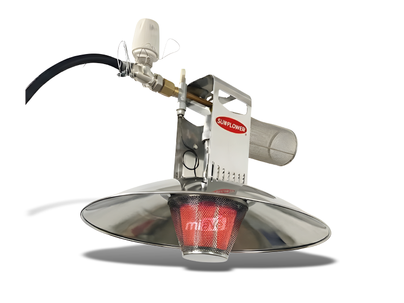 Eficiencia Radiante: Emisor de acero inoxidable que proyecta calor intenso y uniforme hacia el suelo (zona de vida de las aves).