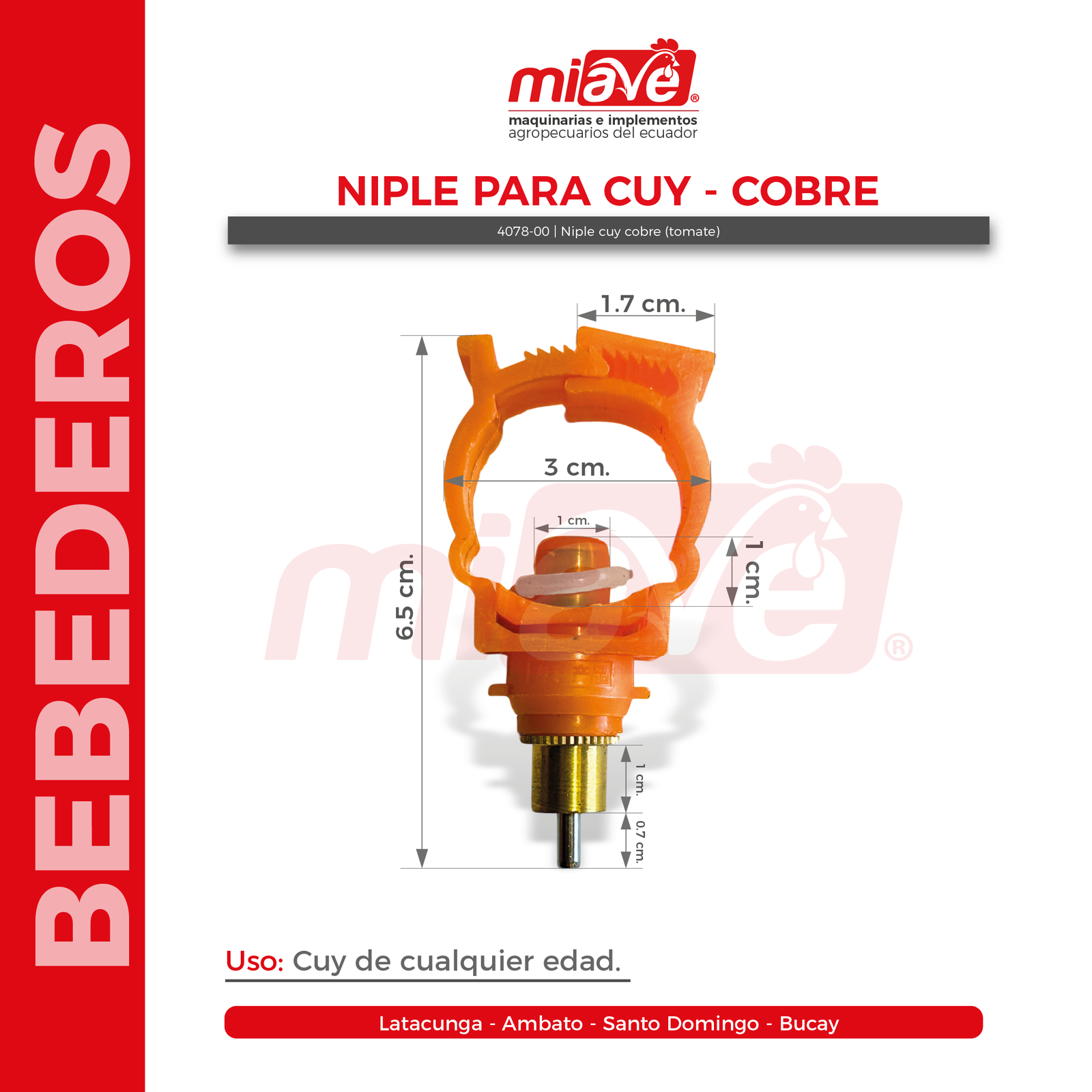 El niple para cuy es un bebedero automático diseñado para suministrar agua de forma limpia y controlada en sistemas de crianza. Funciona mediante presión, permitiendo que el animal acceda al agua al accionar la válvula, evitando derrames y manteniendo el área seca.
